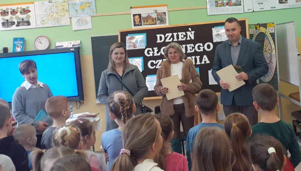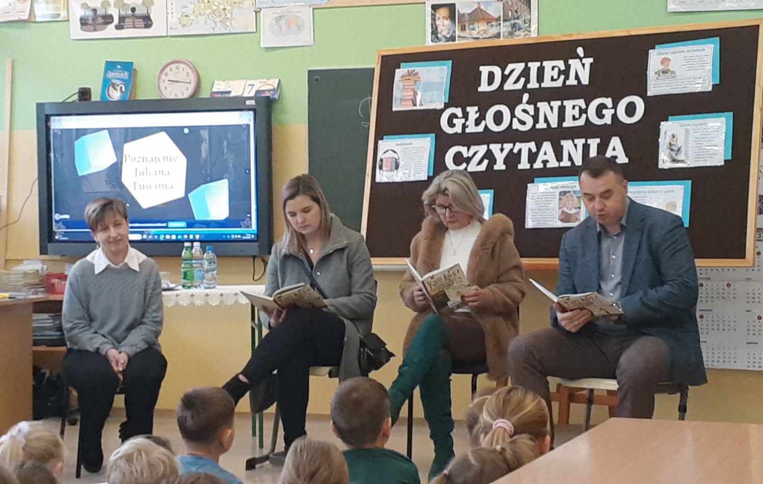 W rolę lektorów wcielili się zaproszeni goście: Burmistrz Miasta i Gminy Zakliczyn Pan Dawid Chrobak, Kierownik Gminnej Biblioteki Publicznej Pani Romana Nosek, przedstawicielka Rady Rodziców Pani Ewa Gierałt oraz Dyrektor naszej szkoły Pani Agnieszka Pomikło. Goście przeczytali uczniom klas I-III książkę autorstwa Agnieszki Frączek „Rany Julek! O tym, jak Julian Tuwim został poetą”. Czytanie poprzedziła prezentacja poświęcona życiu i twórczości Juliana Tuwima oraz quiz dla uczniów sprawdzający znajomość wierszy poety.