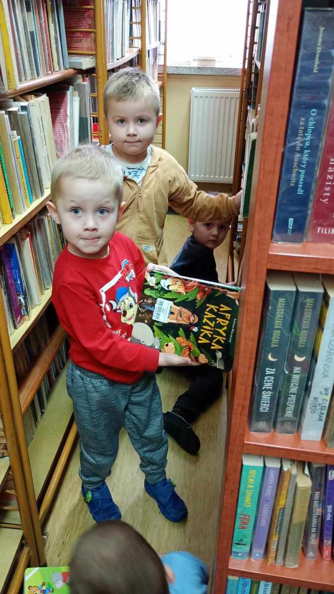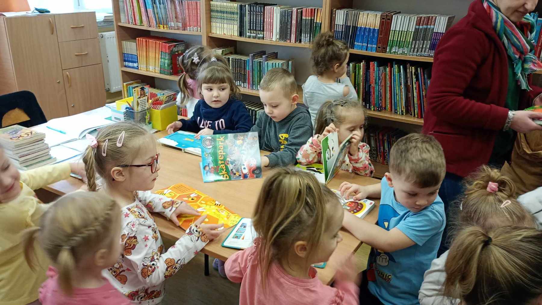 Kształtowanie nawyków obcowania z książką jest bardzo ważne w rozwoju dziecka. Wiek przedszkolny jest idealnym okresem, aby zainteresować najmłodszych literaturą. Regularne czytanie wzbogaca bowiem wyobraźnię dziecka, rozwija słownictwo, rozbudza ciekawość świata. Wizyta naszych najmłodszych przedszkolaków w bibliotece była wspaniałą okazją do zapoznania ich z tym magicznym miejscem. Dzieci z wielkim zainteresowaniem oglądały książki znajdujące się na półkach. Dowiedziały się także, co należy zrobić, aby stać się czytelnikiem biblioteki, jak się w niej zachowywać oraz jak dbać o książki. Wizyta