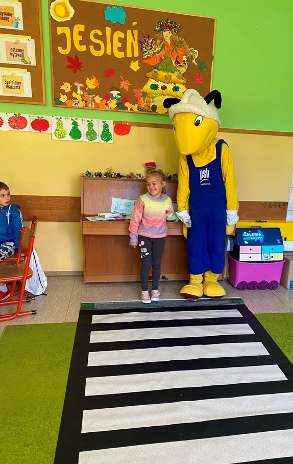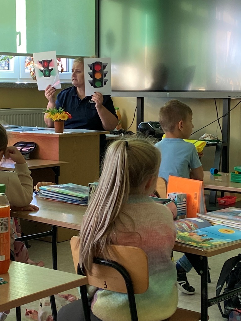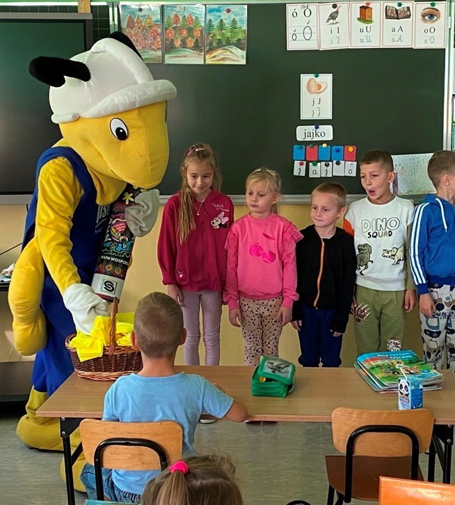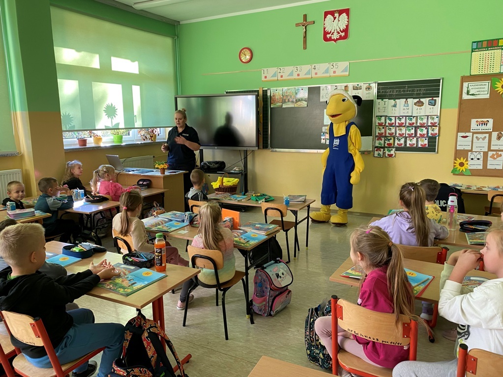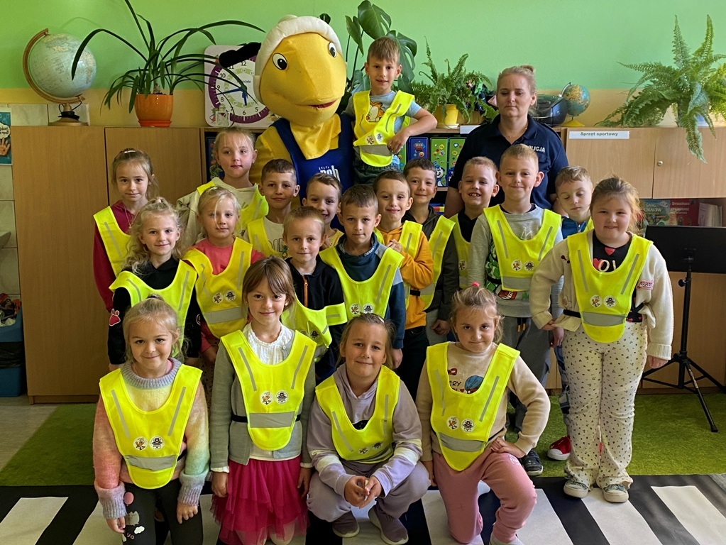 W ramach ogólnopolskiej akcji „Bezpieczna droga do szkoły” 18 X 2024 roku  uczniowie klas pierwszych  uczestniczyli w spotkaniu z przedstawicielem policji w asyście maskotki – Mrówki. Wizyta ta miała na celu utrwalenie  zasad ruchu drogowego oraz zagadnień dotyczących bezpieczeństwa na drodze. Pierwszaki miały okazję brać udział  w ćwiczeniach praktycznych – przechodzenia przez pasy z sygnalizacją świetlną i bez sygnalizacji, poznawały podstawowe znaki drogowe, dowiedziały się jakie znaczenie mają elementy odblaskowe dla pieszych i kierowców.  Pierwszoklasiści bardzo aktywnie uczestniczyli w zajęciach, odpowiadali na zadawane pytania i dzielili się przemyśleniami. Aby lepiej zapamiętali te nietypowe zajęcia i byli bardziej widoczni na drodze otrzymali od Pana Mrówki kamizelki odblaskowe i słodkie upominki.