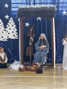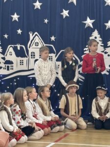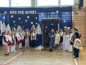 Najbardziej wzruszającym punktem popołudnia były jasełka przygotowane przez uczniów klasy III. W prostych, ale trafnych scenach mali aktorzy przywrócili opowieść o narodzinach Jezusa do bliskości rodzinnego stołu i codziennych gestów — pokazali, że ta historia żyje w domach, opowieściach i chwilach wspólnego ciepła. Ich przejmujące kreacje pełne były niewinności i autentyczności, co sprawiło, że widownia nieraz milczała z poruszenia. Ten teatralny obraz został podkreślony i rozświetlony tańcem uczniów klasy V: biało‑niebieskie szarfy wiły się w powietrzu, tworząc obrazy przypominające zimowe światło i niebiańską ciszę, a rytm tańca wniósł do przedstawienia nutę lekkości i świątecznej radości.