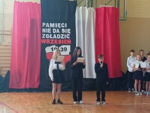 W tym roku obchodzimy 84. rocznicę wybuchu II Wojny Światowej, która swoim zasięgiem ogarnęła pięć kontynentów i pochłonęła miliony istnień ludzkich. 15 września w naszej szkole odbyła się z tej okazji uroczysta akademia upamiętniająca wydarzenia tamtych dni. Uczniowie klas IV-VIII pod opieką Pani Władysławy Kobylarczyk przedstawili ważniejsze walki września 1939 roku, podczas których wielkim bohaterstwem wykazali się nie tylko obrońcy Westerplatte, ale także obrońcy wielu innych miejsc.