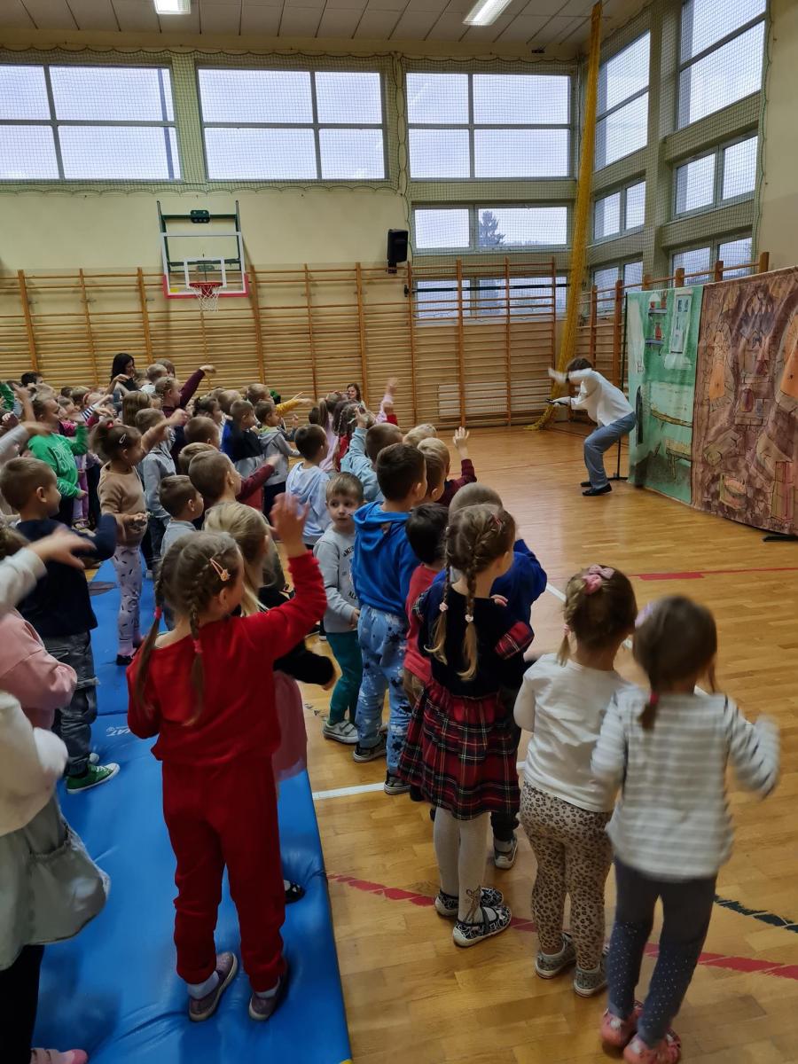 25. października dzieci przedszkolne wraz z uczniami klas I-III Szkoły Podstawowej obejrzały przedstawienie pt. „Podróże Baltazara Gąbki”. Był to spektakl wystawiony przez Teatr Blaszany Bębenek. Dzieci chętnie poznały perypetie Króla Kraka, Smoka Wawelskiego, kucharza Bartłomieja „mamma mia” Bartoliniego oraz Szpiega z Krainy Deszczowców. W trakcie przedstawienia bohaterowie mieli dla widowni ciekawe