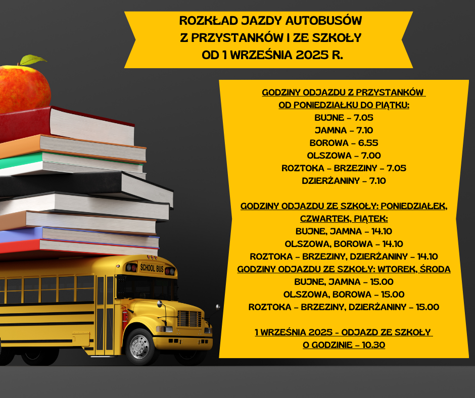 Rozkład jazdy autobusów z przystanków i ze szkoły od 1 września 2025r.