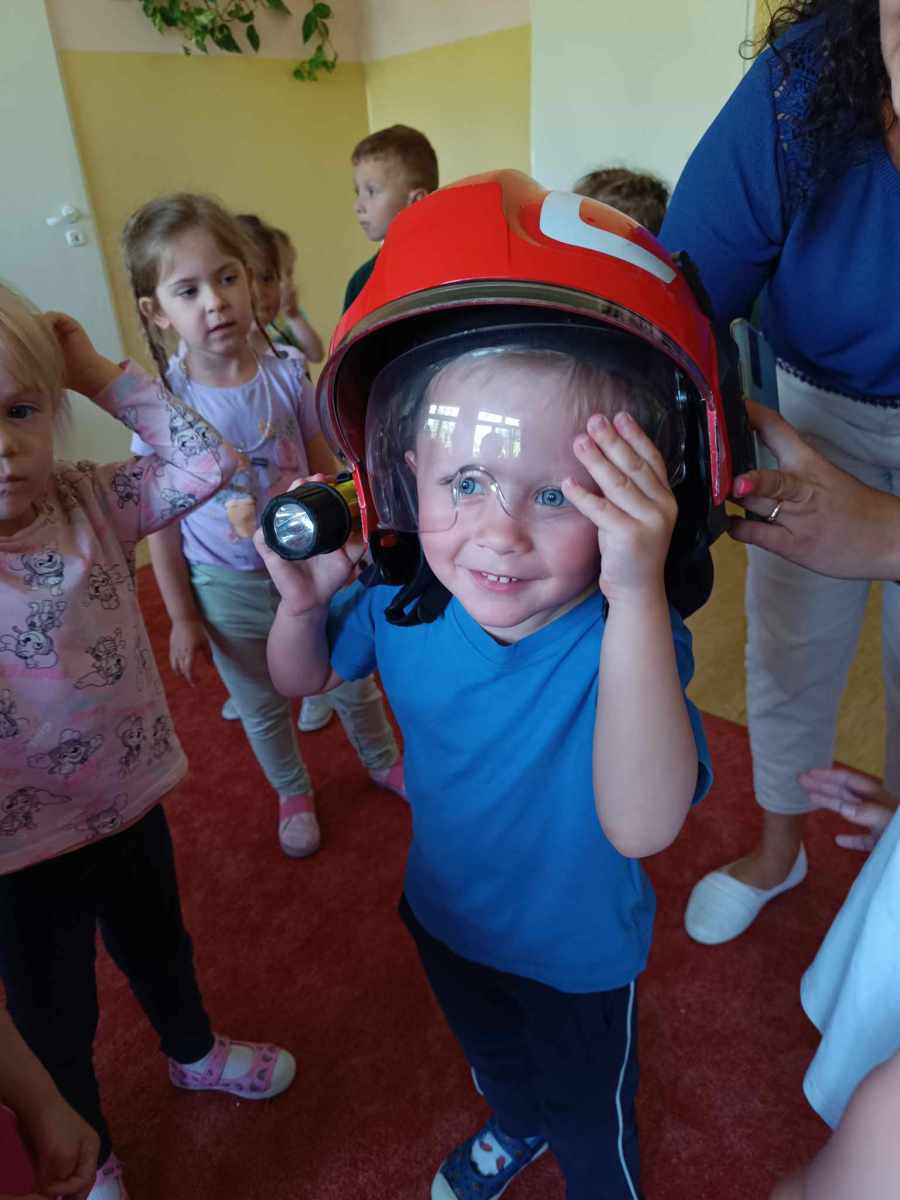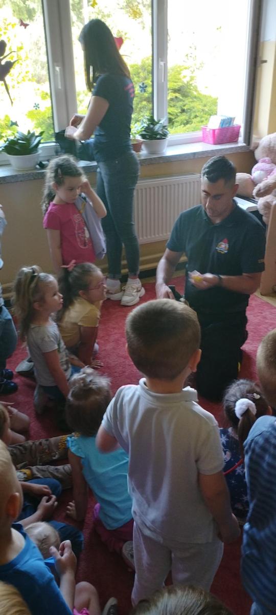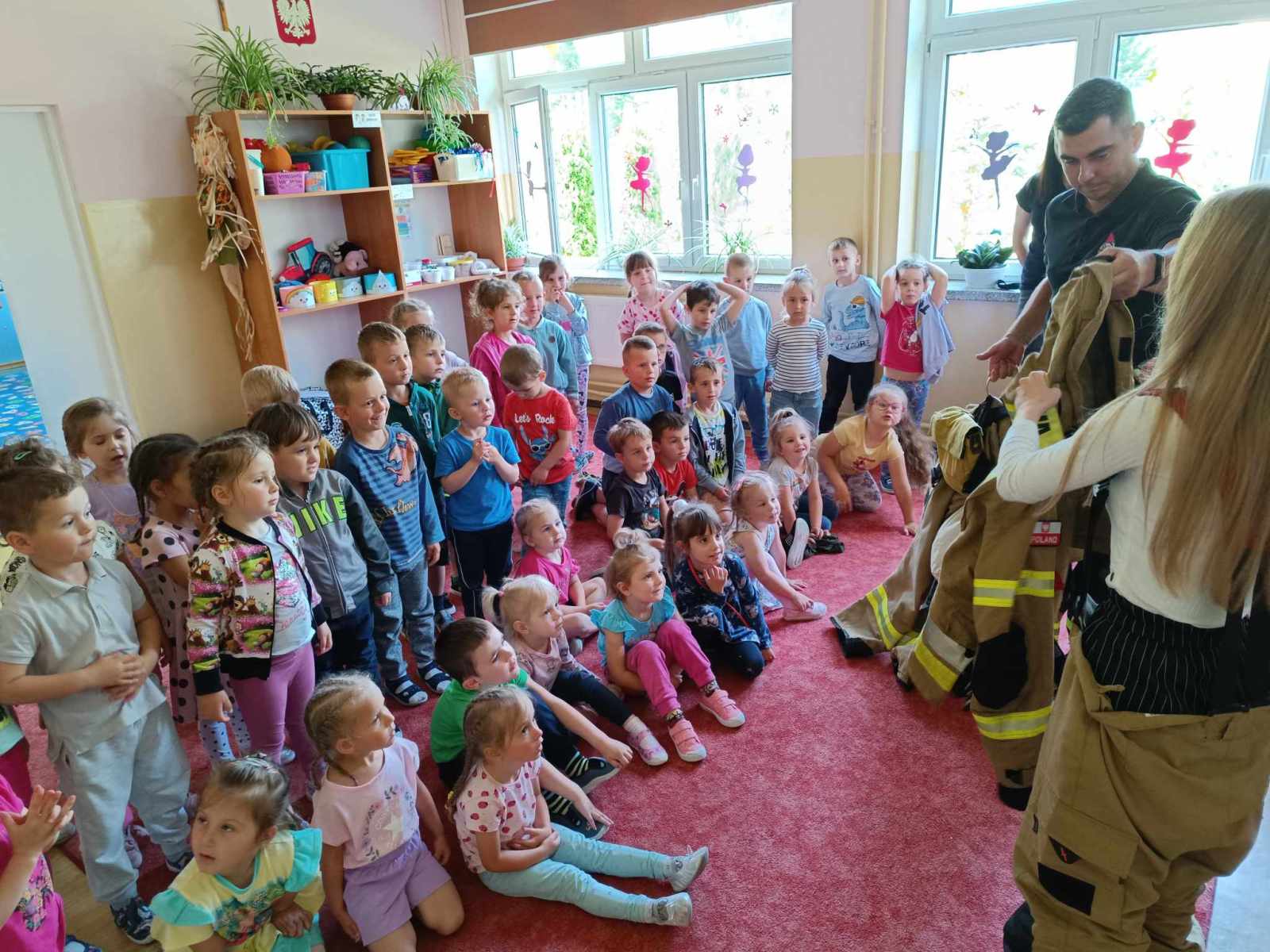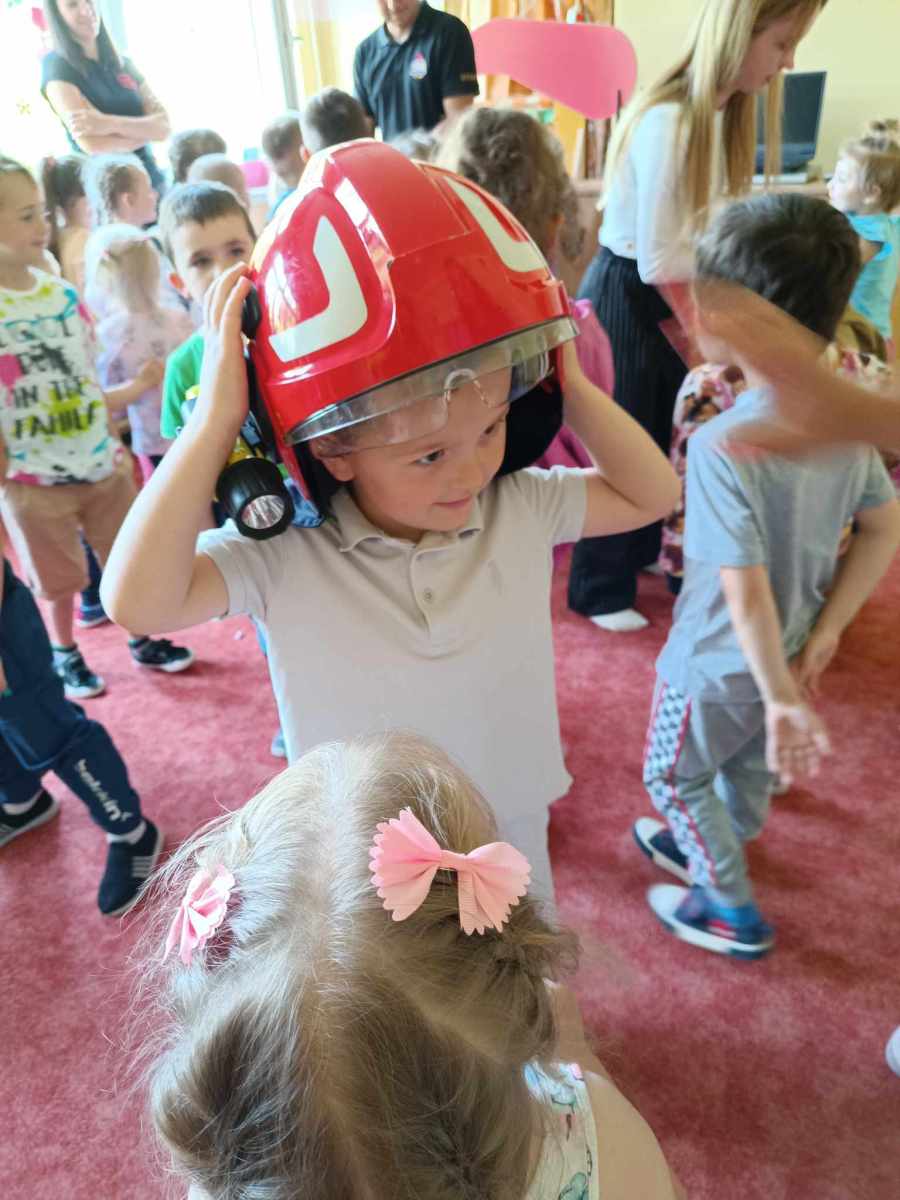 Pod koniec maja w naszym przedszkolu mieliśmy niezwykłych gości: Przedstawicieli Ochotniczej Straży Pożarnej . Wizyta strażaków wzbudziła ogromne zainteresowanie wszystkich dzieci. Jednak największym powodzeniem cieszył się zaprezentowany naszym przedszkolakom specjalny ubiór . Dzieci aktywnie uczestniczyły w spotkaniu. Uważnie słuchały o niebezpiecznej pracy strażaka i chętnie odpowiadały na zadawane pytania.