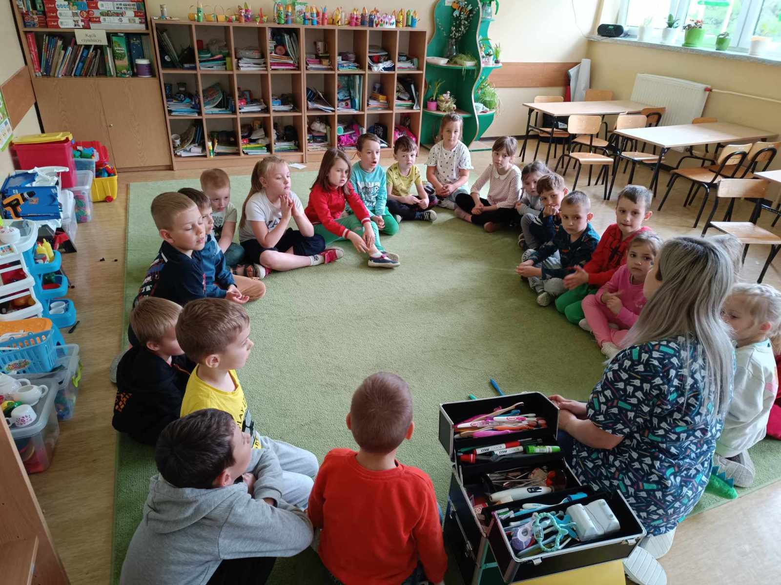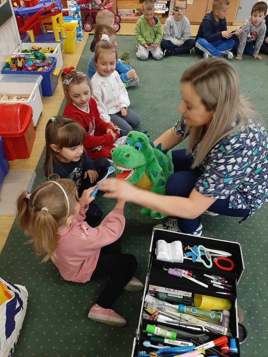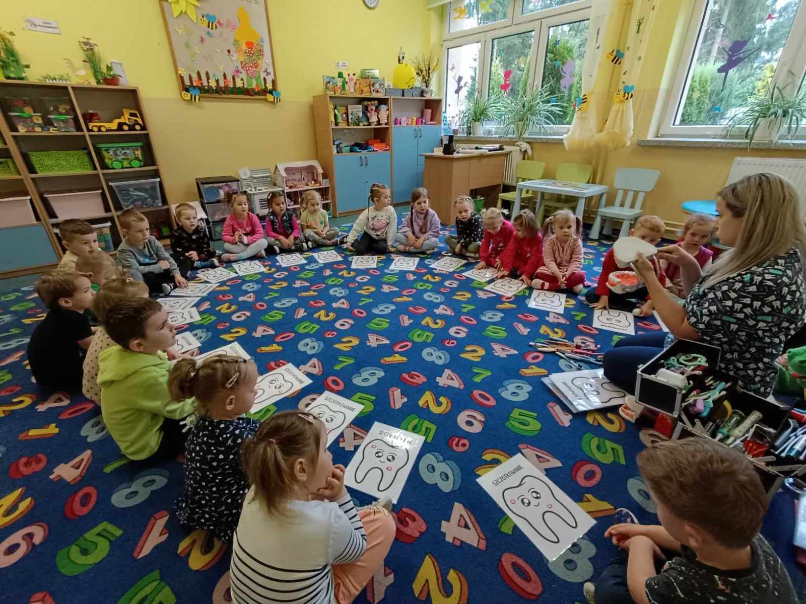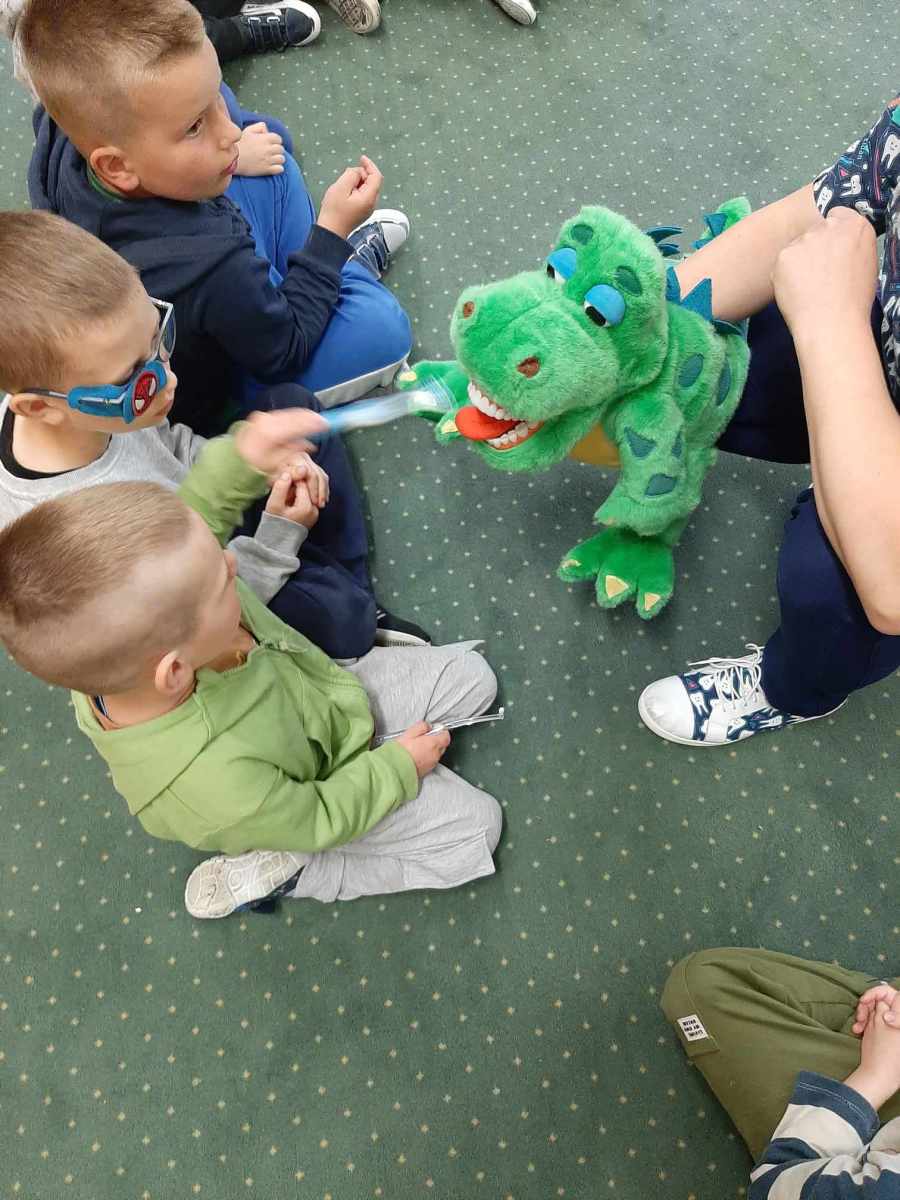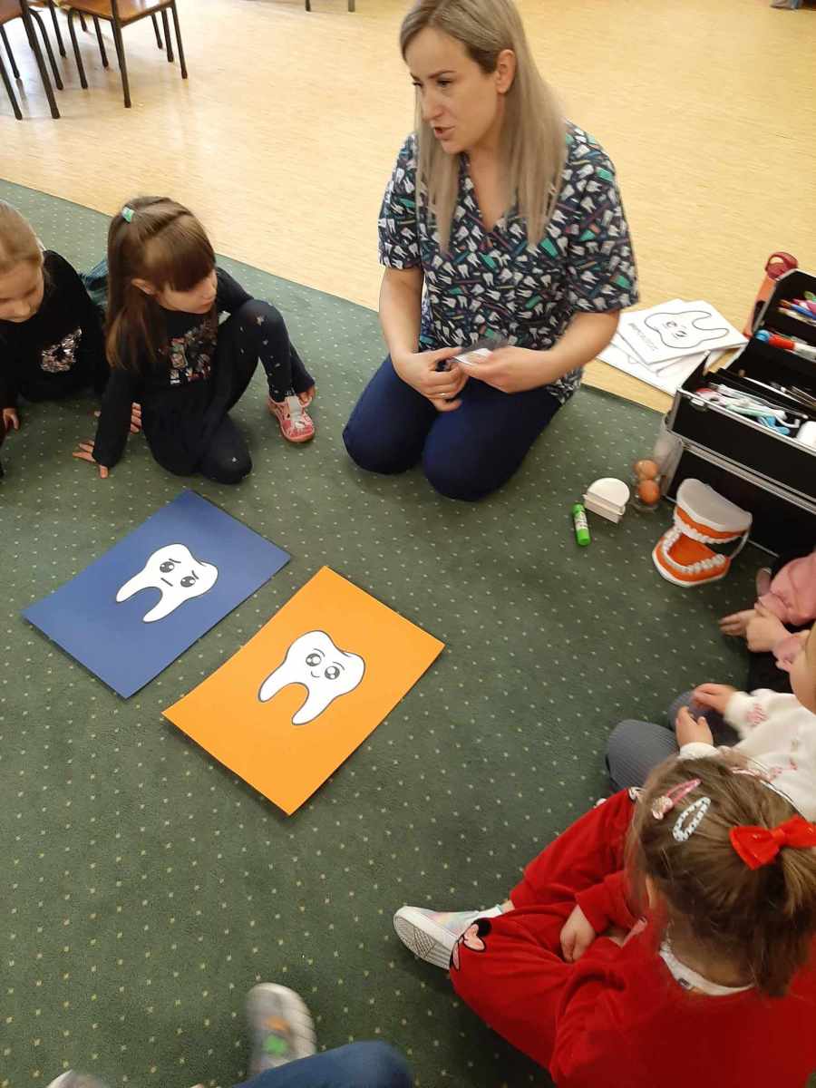 z zainteresowaniem wysłuchały pogadanki na temat właściwej higieny jamy ustnej, próchnicy oraz prawidłowego szczotkowania zębów. Atrakcją były ćwiczenia praktyczne na eksponacie sztucznej szczęki. WRÓŻKA ZĘBUSZKA zwróciła szczególną uwagę na prawidłowe odżywianie się i kontrolne wizyty u stomatologa. Dzieci obiecały, że będą wspólnie z rodzicami dbać o ząbki. Na zakończenie dzielne przedszkolaki dostały piękne upominki. Mamy nadzieje, że jeszcze nas odwiedzi.